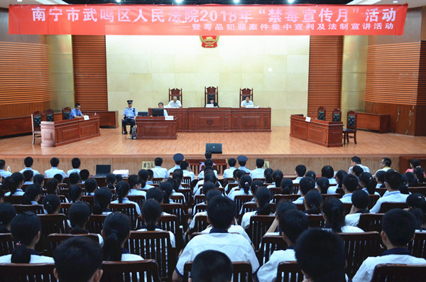 为加大对禁毒工作的宣传力度,提升未成年人对毒品危害及禁毒法律法规的认知程度,迎接第31个国际禁毒日的到来。6月21日上午,我院与武鸣区教育局联合开展2018年“禁毒宣传月”庭审观摩与法制教育活动。 当天上午10时,武鸣区实验学校和武鸣区城厢镇中心校的240名学生走进我院,旁听了杨某某贩卖毒品案庭审全程。庭审中,同学们聚精会神,认真细致地观察了包括法庭调查、举证质证、法庭辩论在内的整个庭审过程,上了一堂直观、生动的禁毒法制教育课。庭审结束后,同学们为法庭庄严肃穆的氛围所震撼,纷纷表示大开眼界,感受颇深,并对庭审过程以及毒品犯罪的危害等展开了热烈的讨论。